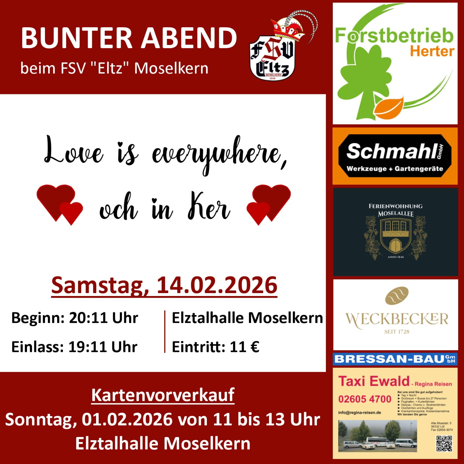 Am Valentinstag, den 14. Februar, findet unter dem passenden Motto "Love is everywhere, och in Ker" unser diesjähriger Bunter Abend statt. Wie immer erwartet euch ein abwechslungsreiches und unterhaltsames Programm, was von den Aktiven ab 20:11 Uhr auf der Bühne der Moselkener Elztalhalle dargeboten wird.